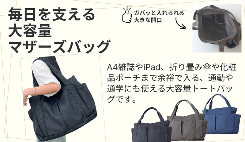 帆布素材なのに驚くほど軽いトートバッグです。 A4サイズが余裕で入るので、母子手帳ケースや着替えセットもすっぽり収まります。