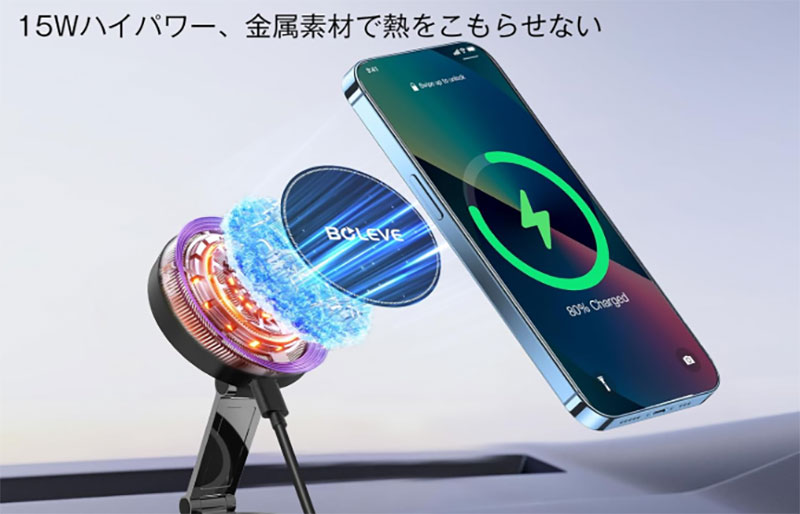 15W急速充電対応で、360度の角度調整も自由自在。 ケース装着のままでも認識してくれました(厚さ2mm程度のケースで確認)。